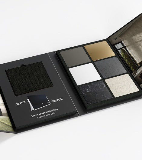 Il campionario della collezione Loewe iconic consente di personalizzare la propria soluzione per l’installazione del televisore iconic. I campioni di colore del supporto da pavimento di Loewe iconic e delle coperture dei diffusori Loewe iconic rafforzano il processo di personalizzazione del design per integrarlo armoniosamente nell’ambiente personale.